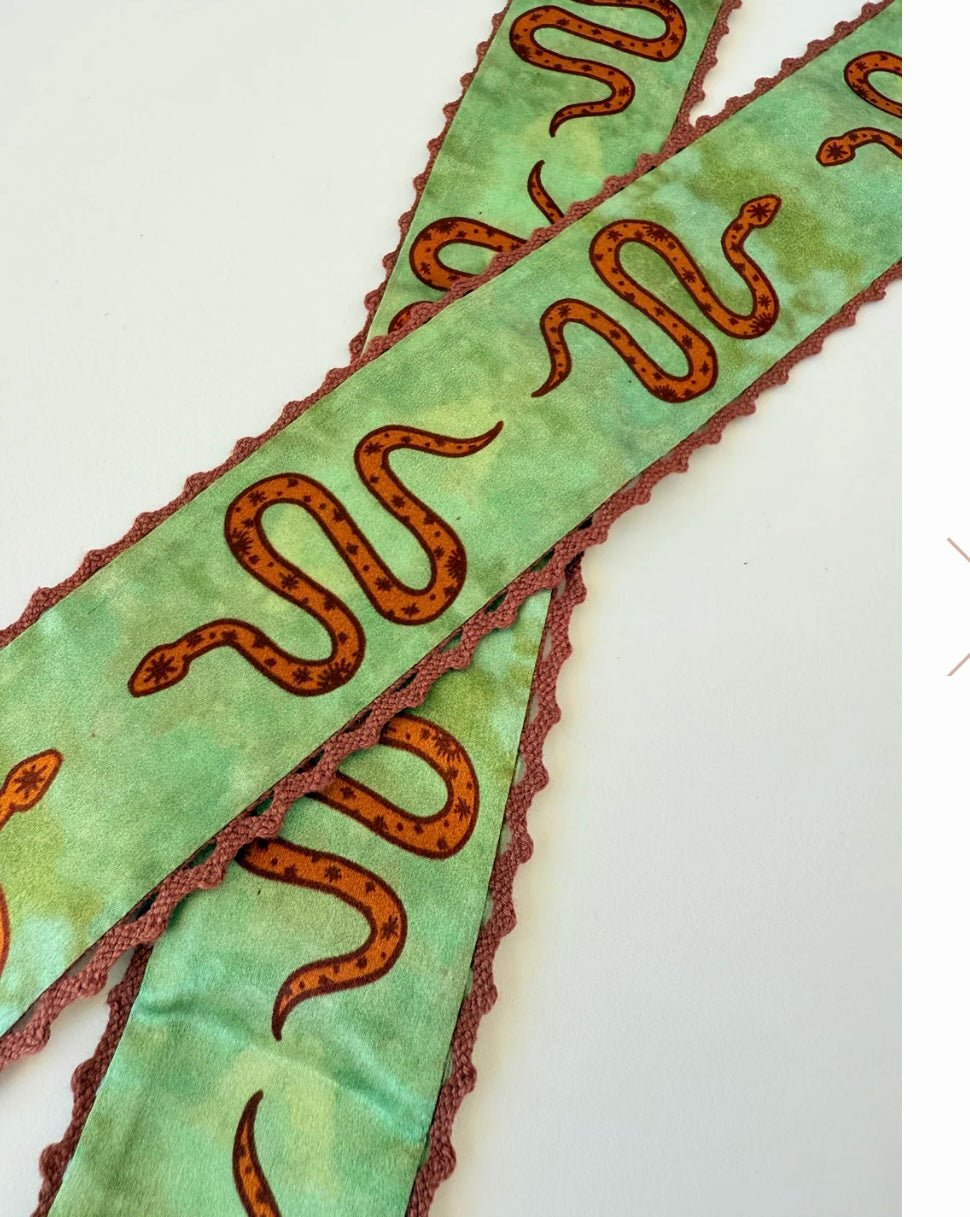 Hand drawn art on a beautiful silk twilly with a crochet trimmed edge.