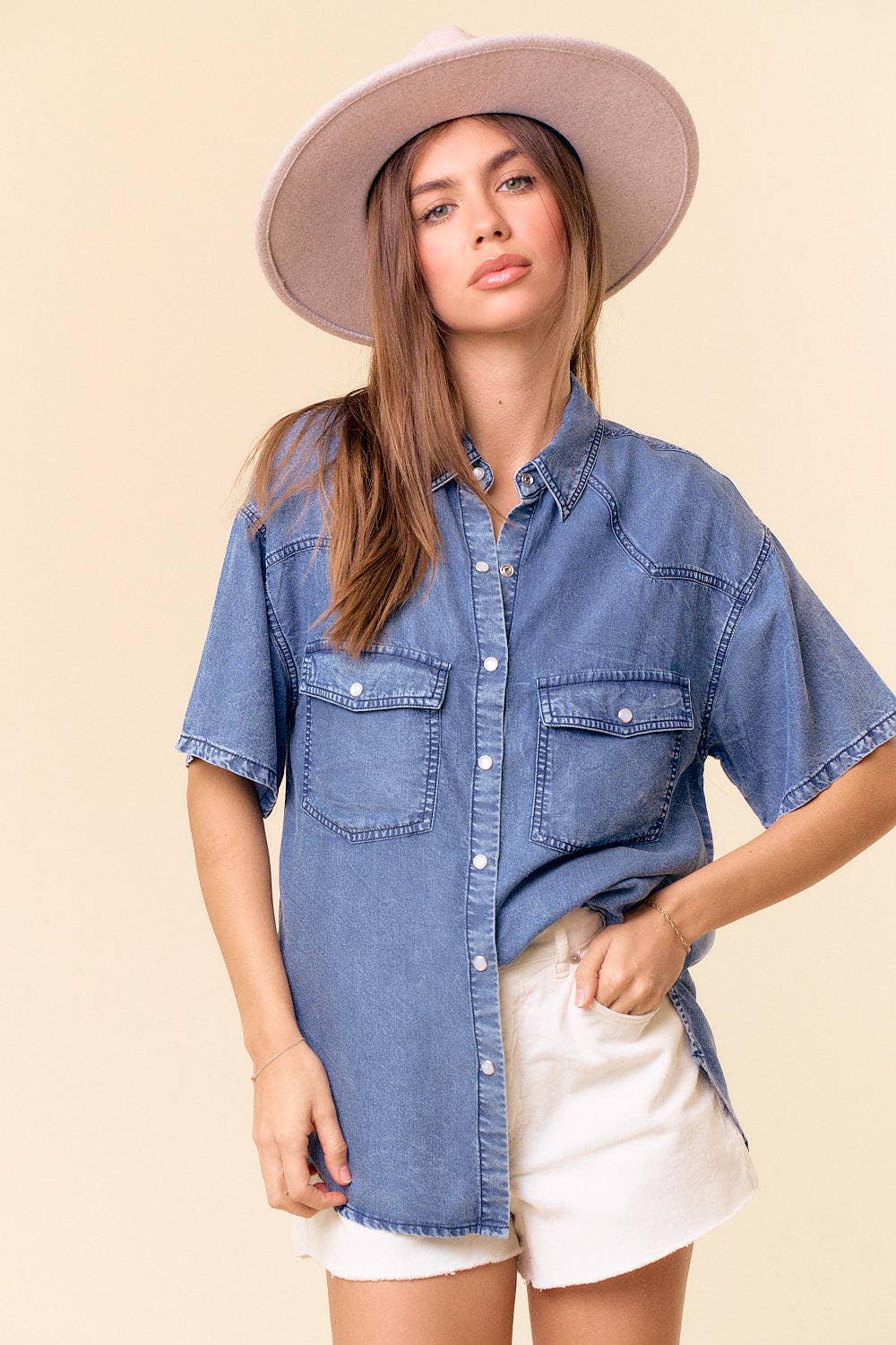 Bring a little western charm to your wardrobe with this short sleeve denim button-up. Featuring a relaxed soft, breathable denim. This top is perfect for pairing with boots and statement jewelry. Style it open over a tank or buttoned up for an effortlessly chic look.